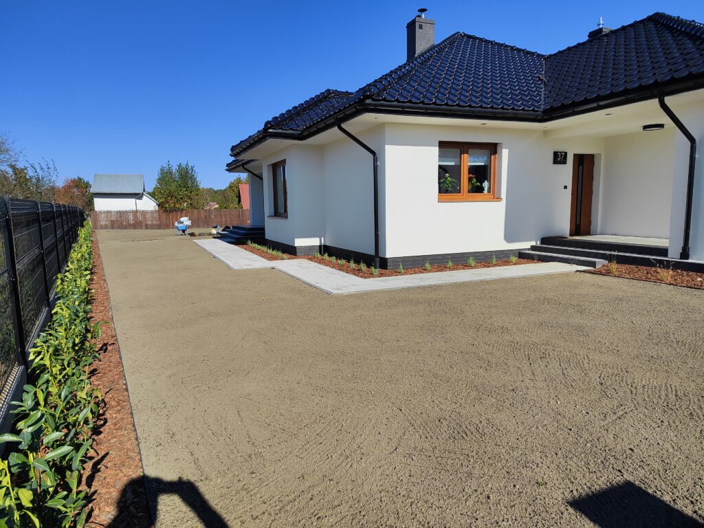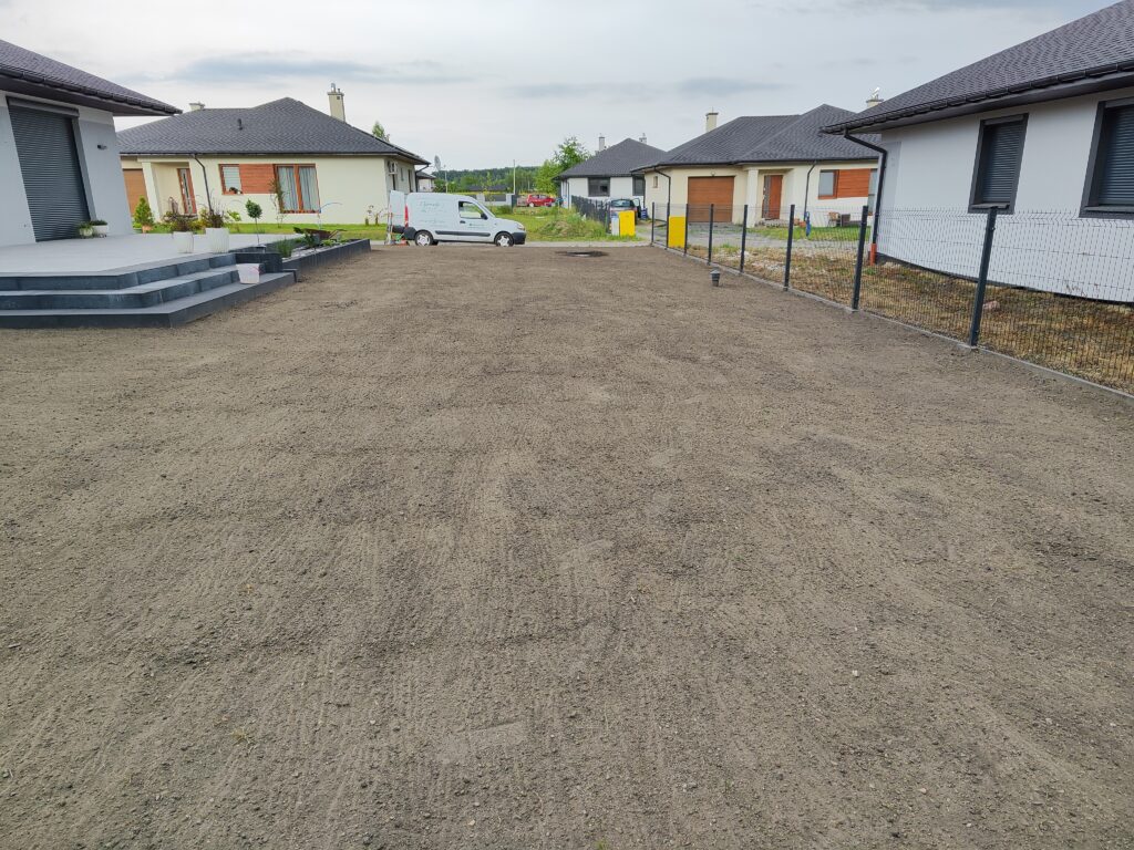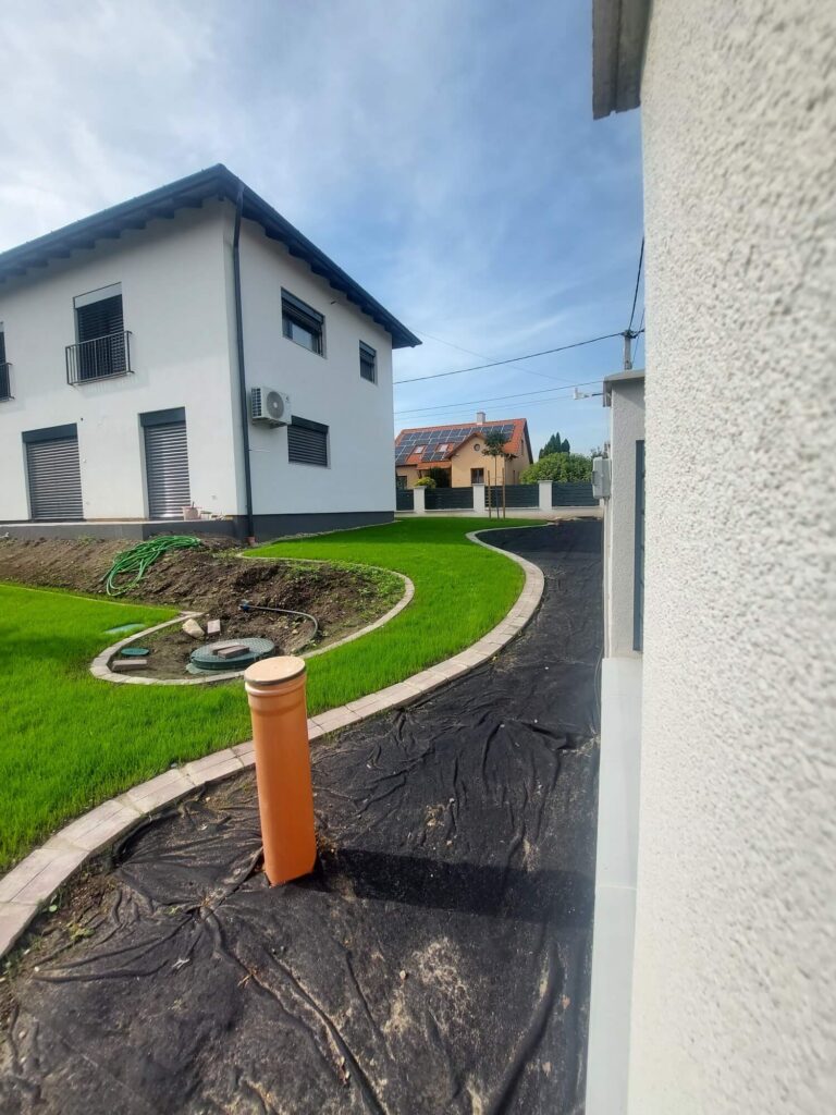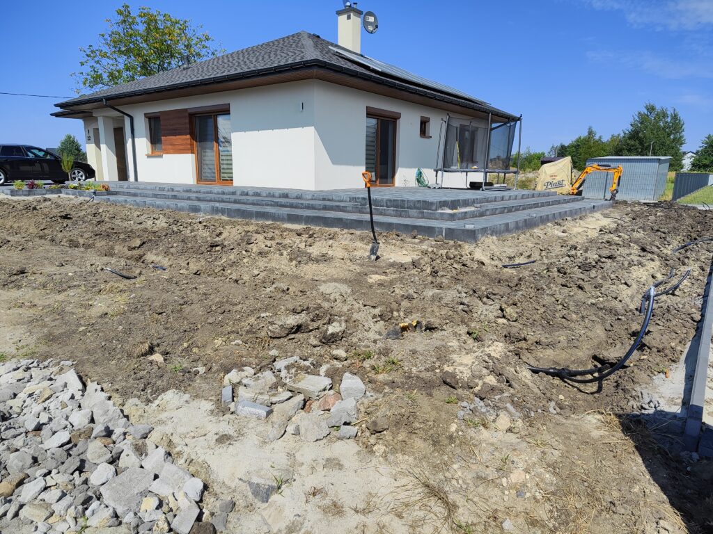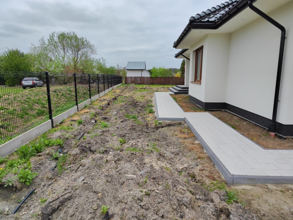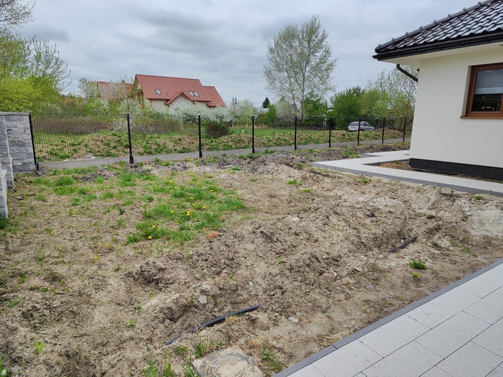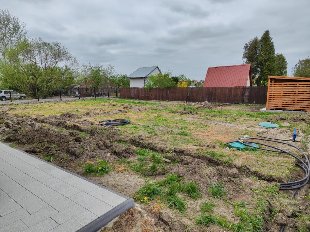 Wykonanie odwodnień, montaż zbiorników na deszczówkę, wykonanie systemów nawadniających, system pozyskiwania wody deszczowej do wykorzystania w domu do celów sanitarnych, montaż siatki przeciw kretom, tarasy, sadzenie roślin, sianie trawy, montaż robotów koszących, itp.